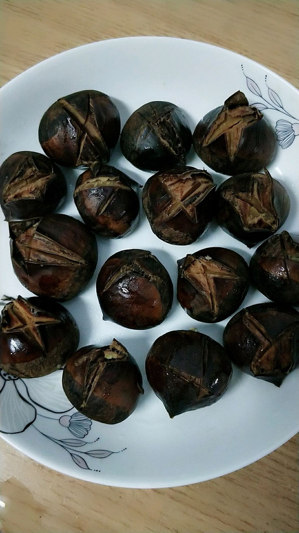 板栗倒入电饭煲内,加入比板栗少一半的清水,四勺白糖,少量食用油