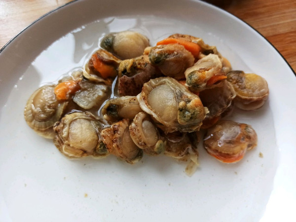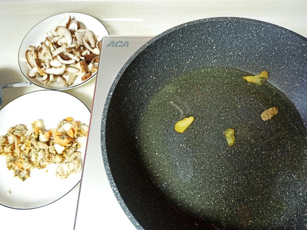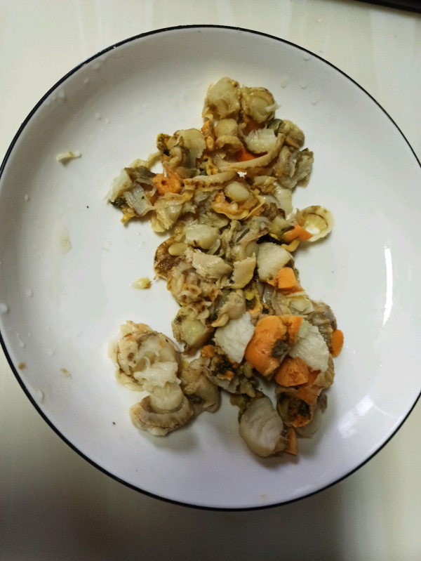 然后把扇贝肉也倒进去炒一下,并且加点料酒去腥。
