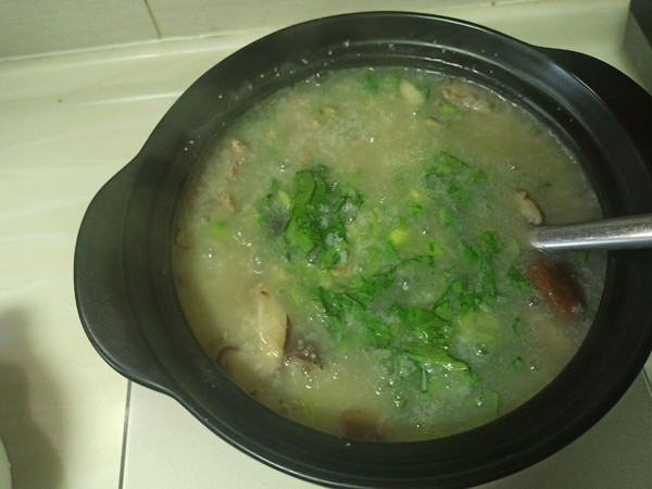 等粥熬粘稠了就把把炒好的扇贝肉跟香菇倒进锅里面,小火熬一下,熬个三五分钟。最后把青菜碎也倒进去就可以了.加入调料