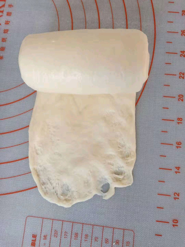 发酵好的面粉拿出来放在垫子上轻拍排气,然后分割面团平均分三个,大概150~160克一个机子。把面团搓匀搓圆,然后醒发一下,醒发10分钟,然后把它擀长再卷起来。