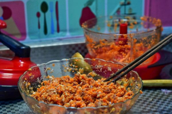 将胡萝卜和腌制好的肉馅混合