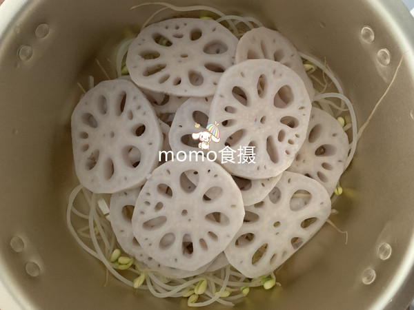 莲藕与豆芽烫熟捞起放进盆里备用。