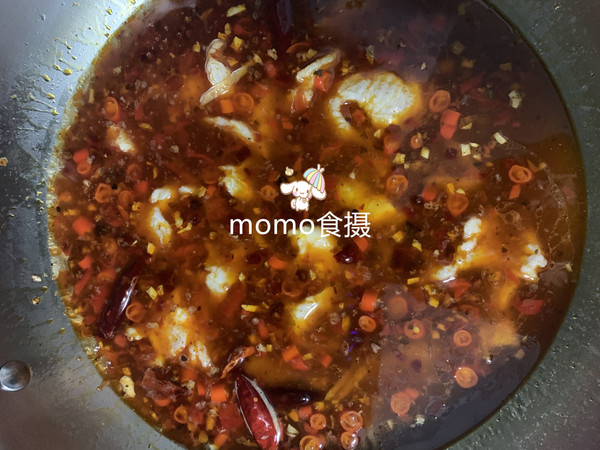 巴沙鱼顺纹路45度斜切片,加入料酒、盐和淀粉拌匀,腌制一会。起锅烧油,放入泡椒炒香,放入子姜。