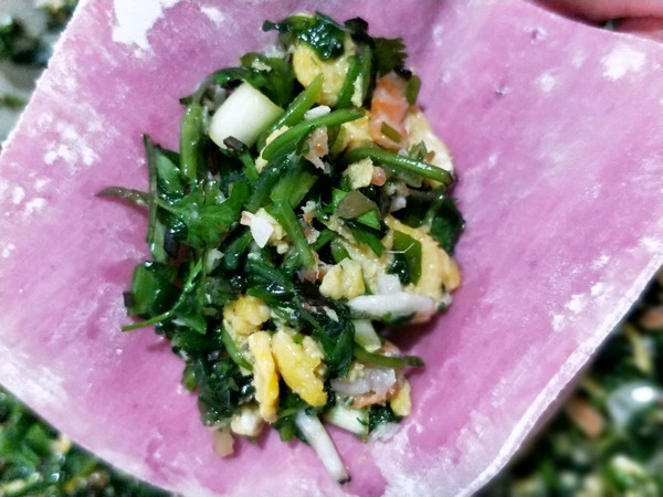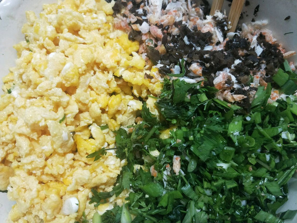 和馅,将荠菜用盐腌下,挤出水分,切碎与炒好的鸡蛋木耳 虾皮及调料一起拌匀。