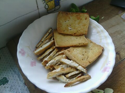 开始煎豆腐喽!待油七分热时,放入豆腐煎炸至两面金黄及可出锅。切成丝状备用。