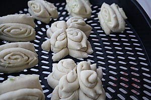 切块后从中间压一道,放在蒸盘上,放在暖和处醒发20-30分钟,大概发到1.5倍大。