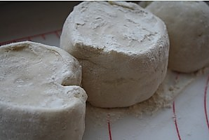水量较少揉好的状态,使用刮刀将面团取出,揉制整形成圆形。