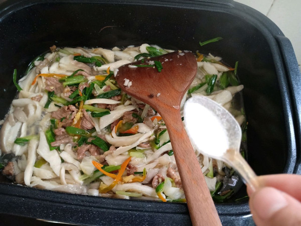 多功能锅预热好了放油烧热了放肉丝进去翻炒几下