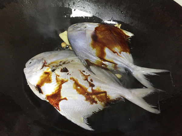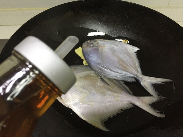 放入去除内脏,清洗干净的鲳鱼,加少许料酒