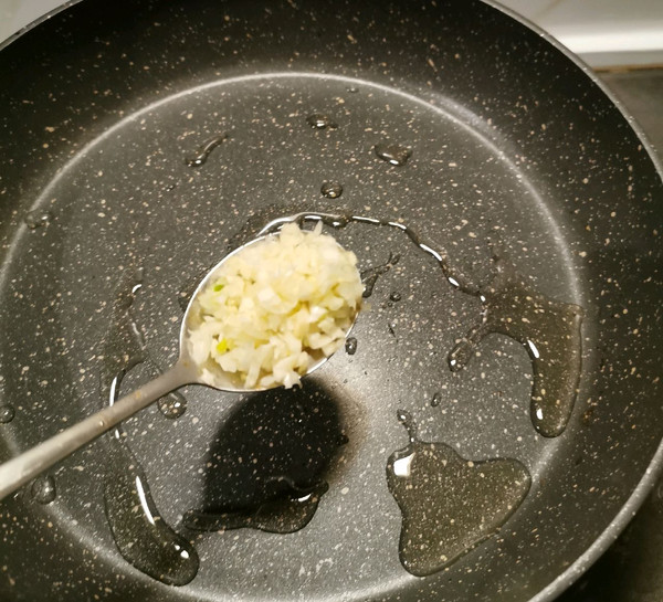 取一汤匙蒜末放入碗里 放入半汤匙淀粉 倒入2汤匙清水 搅拌均匀 蒜蓉湿淀粉调制好 备用
