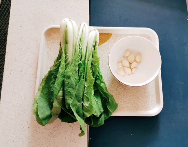 蔬菜切成段备用 菜梗和绿叶分开 蒜切碎末
