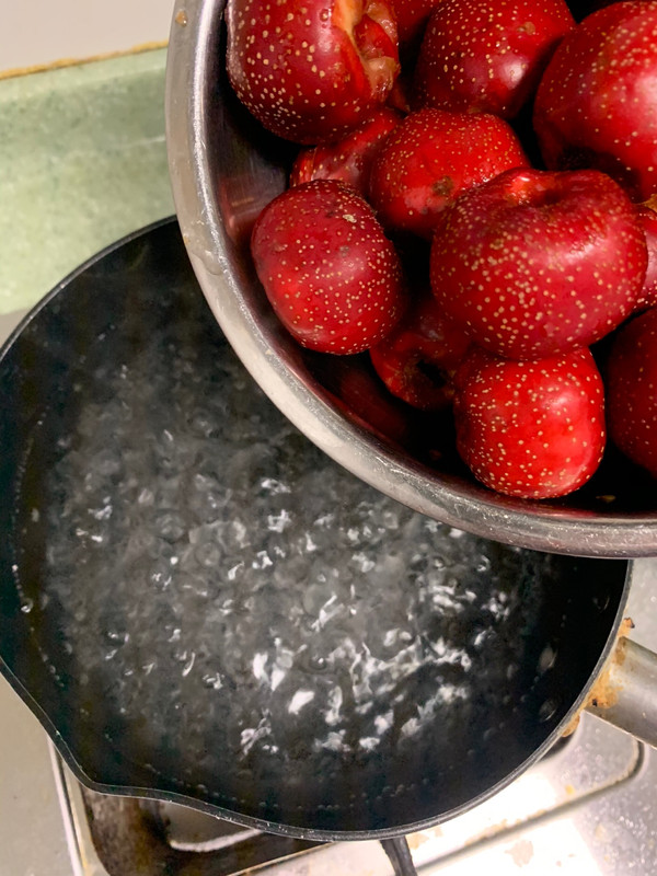 山楂洗净(用淡盐水浸泡5分钟),去核。咱有去核神器(某宝有卖)。没有的用筷子扎透,切块也可以,不过成品没有那么好看啦!