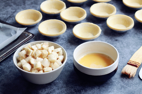 挞皮取出室温稍微回软。熟香蕉切小丁块儿; 鸡蛋液是用于刷表面,也可以只取蛋黄。