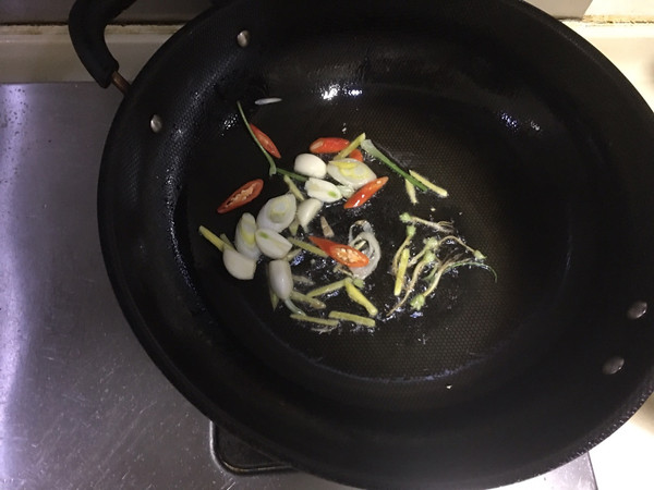 热锅冷油,油沸后,加入姜葱蒜辣椒末,爆炒出味道。