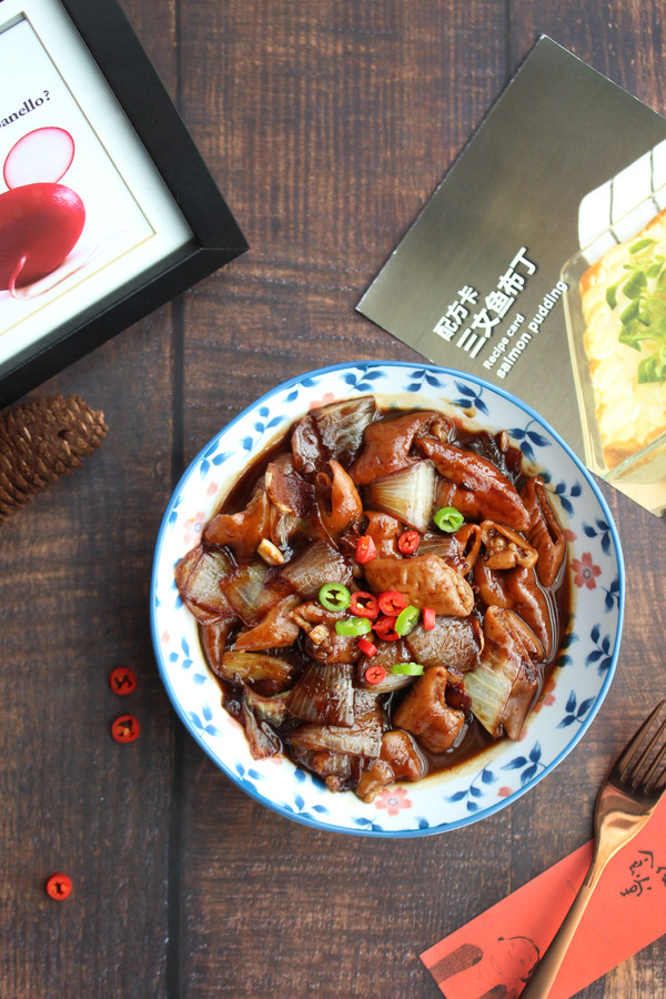大肠切小段,洋葱切块,姜切片,大蒜切末