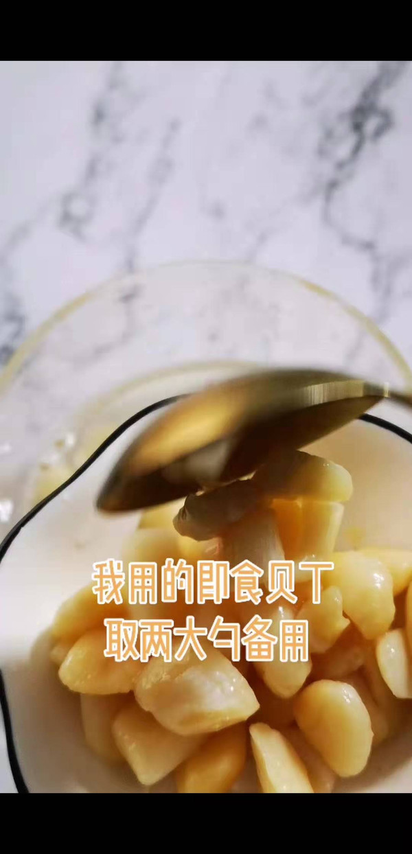 即食贝丁冲冼干净,取两勺。 如果是干贝,要充分泡发,最好是泡发后加水加姜片上锅蒸25分钟以上。