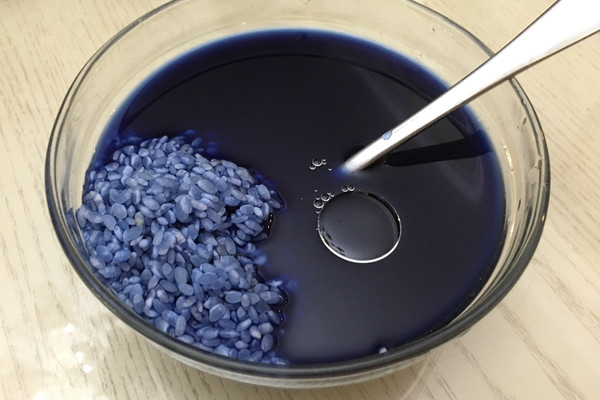 泡了一夜的米,蓝色已经浸入骨髓,水米一起倒锅里煮成饭,水量受米和锅具影响,若不够,可酌情添加;