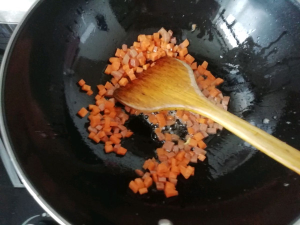 接着加入胡萝卜丁翻炒均匀。