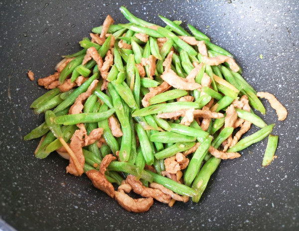 下入豆角翻炒至变色。