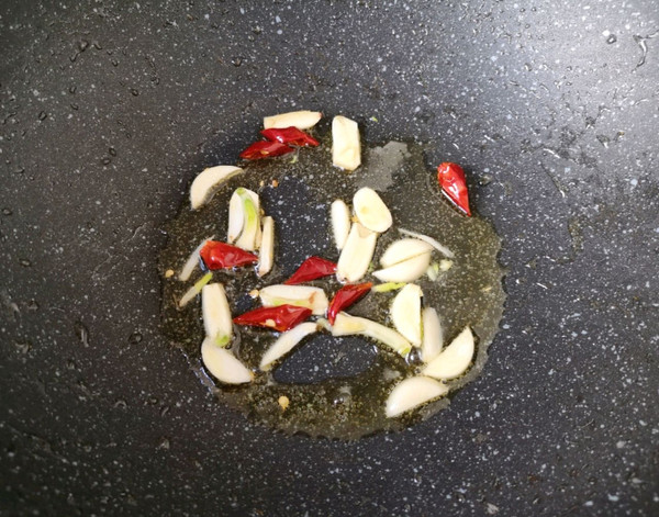 锅底留余油,下入大蒜和干红辣椒炒香。