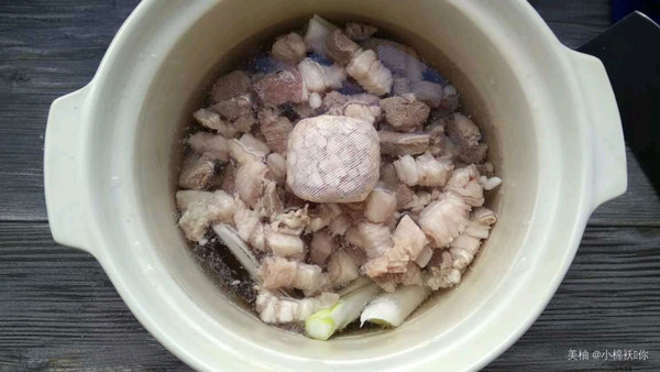 大葱切段,生姜带皮拍烂放入砂锅垫底