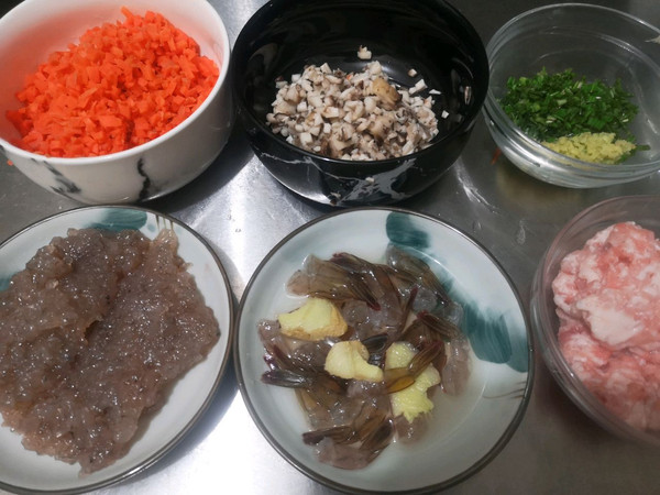胡萝卜,香菇焯水切丁,鲜虾去壳剁成虾泥,虾尾用料酒和生姜腌制装饰备用,五花肉剁细备用,适量生姜葱花。