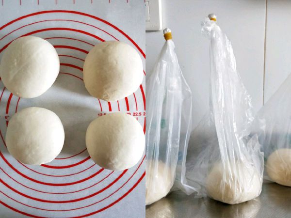 取出面团松弛20分钟,再平均分成4份,揉光滑,今天做一个披萨其余三份面团装进食物保鲜袋,留出足够的空间在保鲜袋顶端扎紧口,放冰箱冷藏发酵,隔天孩子想吃直接取出面团即可。