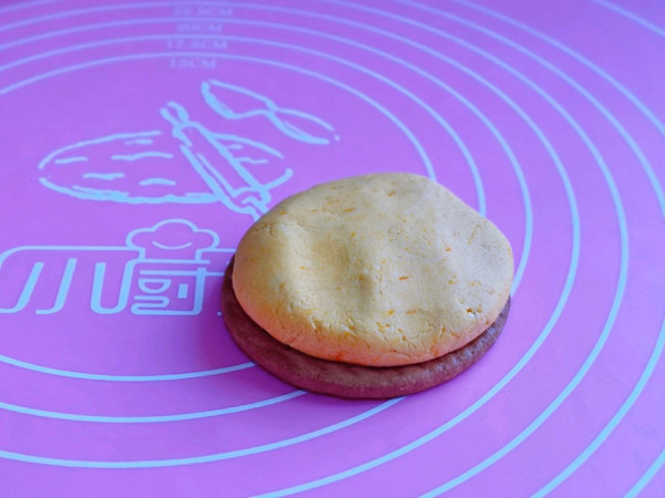 取一块饼干,南瓜面团用掌心轻轻压扁,放在饼干上,压制与饼干同样大小即可。
