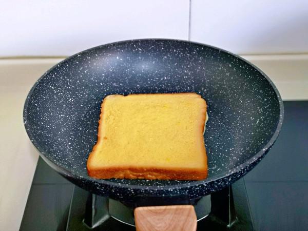 平底锅中刷少许食用油,放上裹满蛋液的吐司片,小火煎。