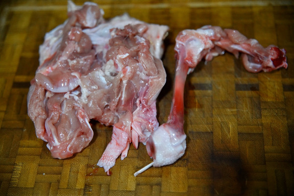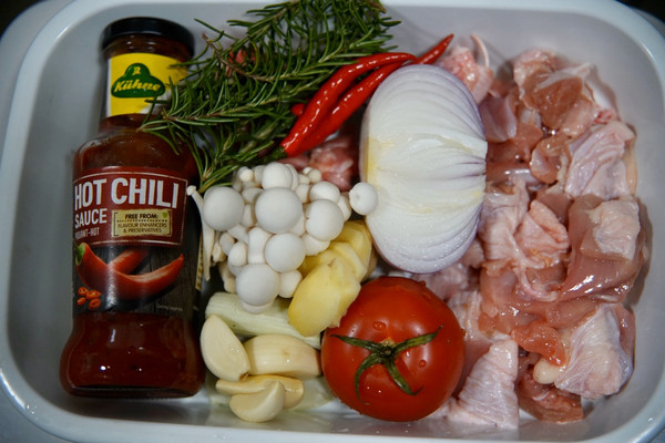 加少许水,煎黄的鸡块码入锅中,汤汁没过鸡块,加入2株迷迭香,煮滚厚转小火。