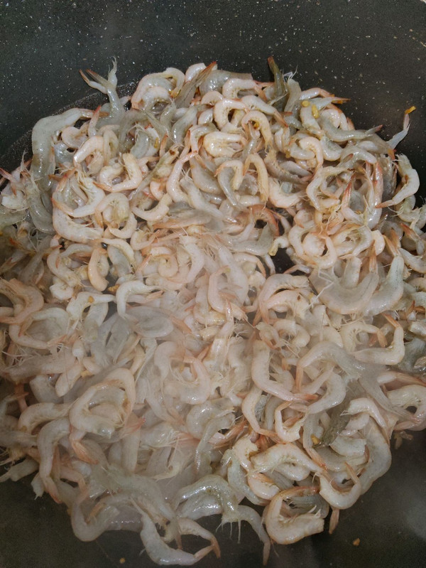 翻炒至小海虾干水、外壳变得油亮亮的,就可以了。