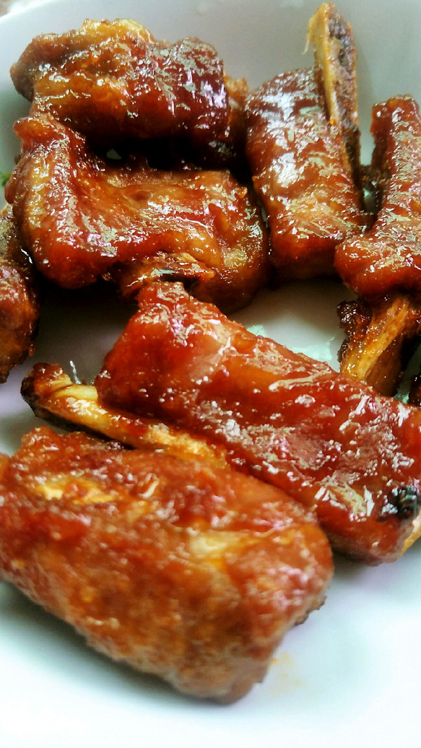 排骨砍段,用清水泡10分钟去除血水,抓干。放盐、酱油、奥尔良腌料、蒜蓉抓匀腌4小时左右。准备两双竹筷子、一个瓦碟子。排骨拍上生粉排在竹筷子上。