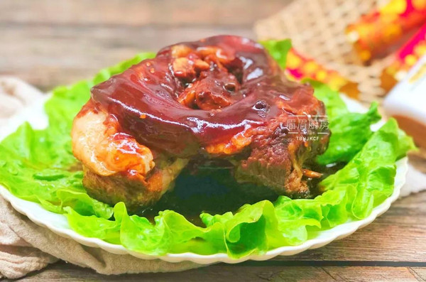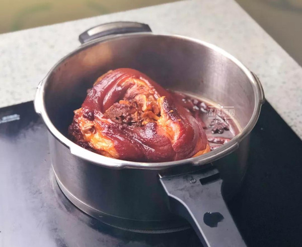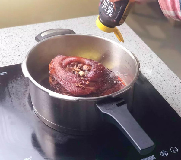 准备食材和工具:酱油心生50克、小鲜侣调味汁30克、肘子1块、姜片适量、干辣椒适量、花椒适量、八角适量、香叶适量、白寇适量、桂皮适量、6颗冰糖、1小勺盐、料酒100毫升、老抽适量、植物油适量、1碗水淀粉 鹅妈妈钛晶锅、鹅妈妈压力锅