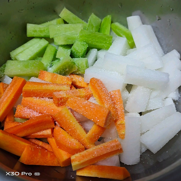 萝卜去掉水分,放入干净的容器,加姜片,泡椒,泡椒水,晾凉的香料水,密封即可。