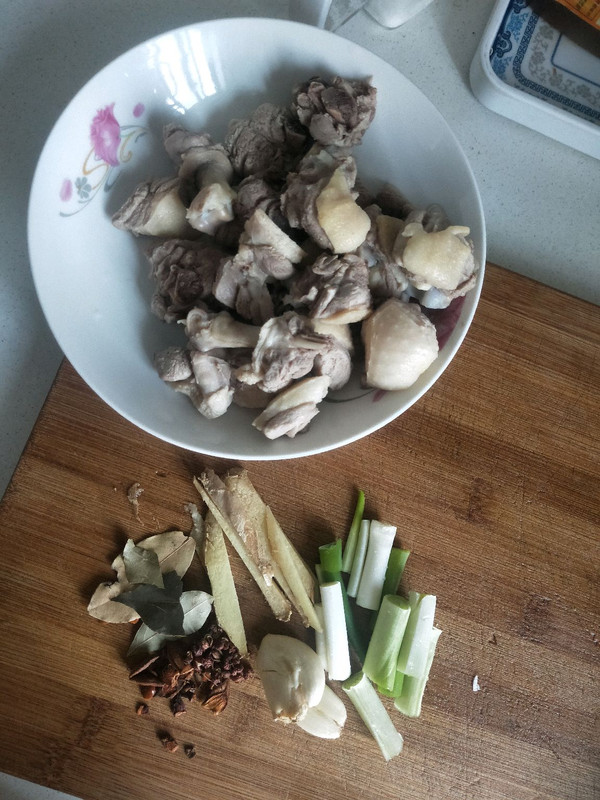 鸭腿切块冷水下锅放一勺料酒煮出血水,八角香叶花椒,葱姜蒜切丝备用