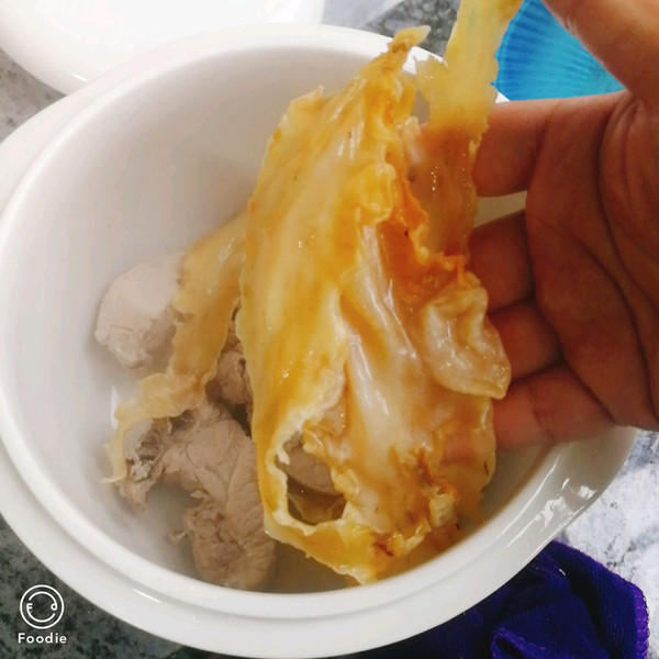 把泡好的花胶,响螺肉,红莲子,淮山,扇骨放进炖锅里。