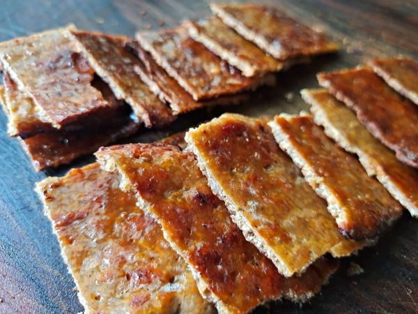 放凉后,用剪刀或刀切小块。可放进瓶子里,当零食吃噢
