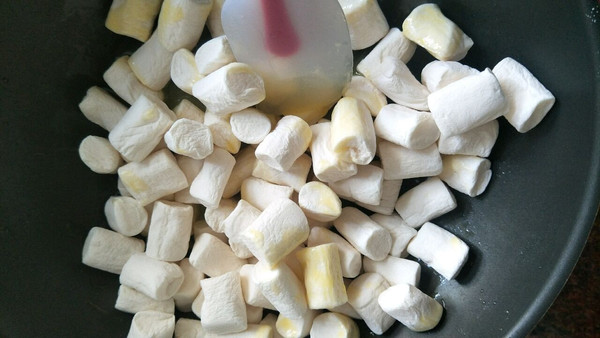 加入白棉花糖,小火炒至棉花糖和黄油彻底融合,变顺滑。