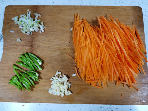 胡萝卜切丝,辣椒切丝,葱蒜切碎。这个辣椒不太辣,喜欢吃辣的可以换成小米辣。