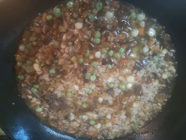 继续加入糯米饭,开锅后小火儿炖煮至收汤(一定要注意翻拌,避免糊锅底)。