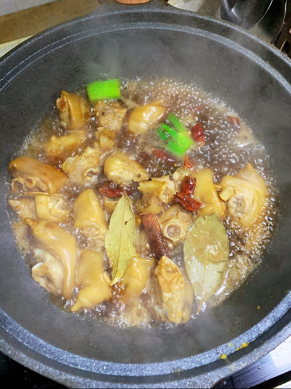 锅中放入少许油,化冰糖,冰糖化至冒泡就将猪脚放入翻炒,挂糖色,再加入生抽、老抽、生姜、大葱、翻炒后加水,放入八角、桂皮、花椒、干辣椒炖煮