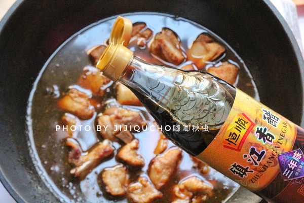 倒入排骨汤煮开,再倒入生抽与恒顺三年香醋,倾泻而下的醋不仅让你一个爽,而且是香到爱不释手心情舒畅胃口大开,香味会更浓郁,(要知道这款恒顺香醋是我家经年不换的牌子,做菜的时候,我也经常会偷尝一口,因为它是酿造醋,与那些普通的醋有所不同,尝一下它的酸味柔和,稍带甜味、不涩、回味绵长。而那些普通的勾兑化学调出来醋有一股很刺激的冰醋酸味。这款醋液体浓稠,底部有少量沉淀,那些劣质配制醋则是液体稀薄,有透明感,色泽暗红或无色,易浑浊。所以大家选醋时一定要长个小心眼哦)