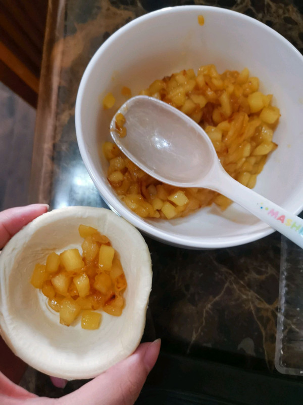 倒入苹果中,翻炒至浓稠,关火,加入盐,搅拌均匀,冷却备用。