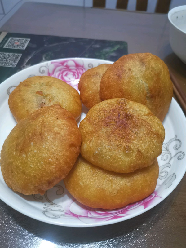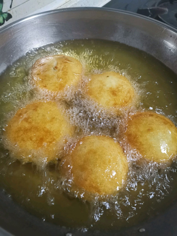 油温200度左右,不知道油温,可以放筷子头下去,筷子冒泡即可下锅炸吧,全程中小火慢炸,中间要翻两三次面,如果想炸的颜色深一点儿,等糖糕从油锅底部飘起来后(此时就快熟了)改大火。再筷子经常性翻面炸个一分钟就可以啦。