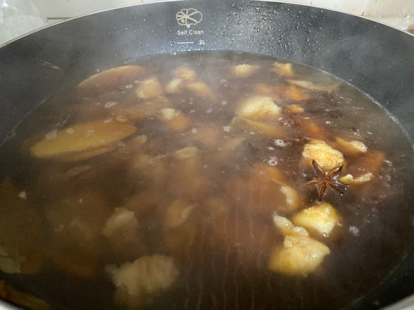 放入肉块中火翻炒三分钟 再放入冰糖几粒翻炒 倒入两勺红烧汁 一勺生抽 一勺黄酒 八角桂皮香叶 继续翻炒至肋条肉块上色