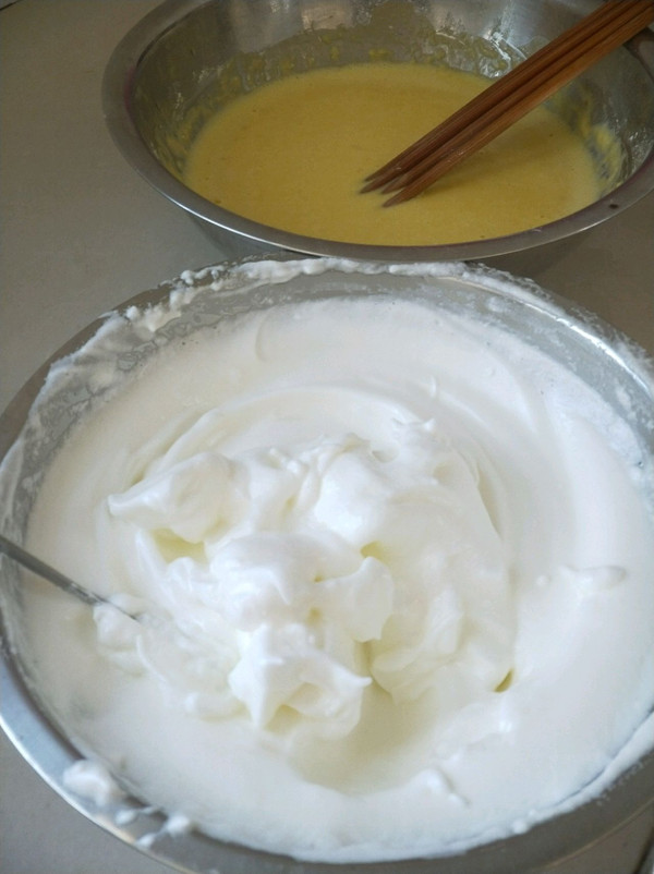 接着把打好的蛋清分三次上下拌匀,别搅拌哦