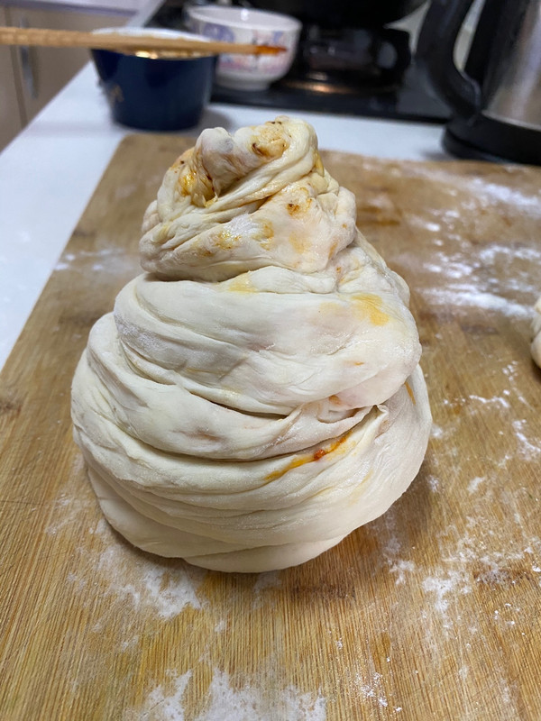卷好的面上下都捏住,不要让辣椒,油,留出来,卷像麻花一下扭一下,如图。