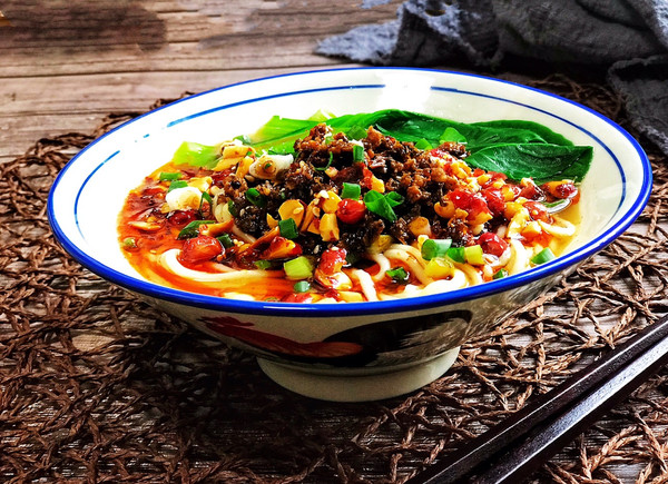 煮面,烫青菜,把料碗的食材放入碗中,加少许高汤,咸淡自己掌握,放入煮好的面条,加满满的辣油。