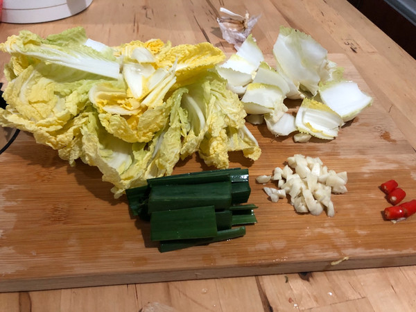 娃娃菜切开,按菜叶和菜帮分好,姜切片,蒜切末,蒜苗和小米椒切段备用