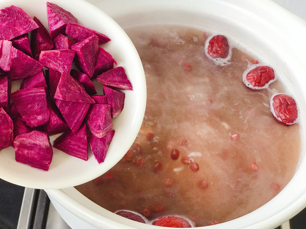 加入紫薯后再中小火熬20分钟左右,紫薯块已经被软化到融入汤中,粥的汤汁会越来越粘稠,颜色也变成了诱人的浓紫色,用汤勺捞起部分食材,看到红豆粒被煮开花、莲子被煮到粉糯状就可以关火了。